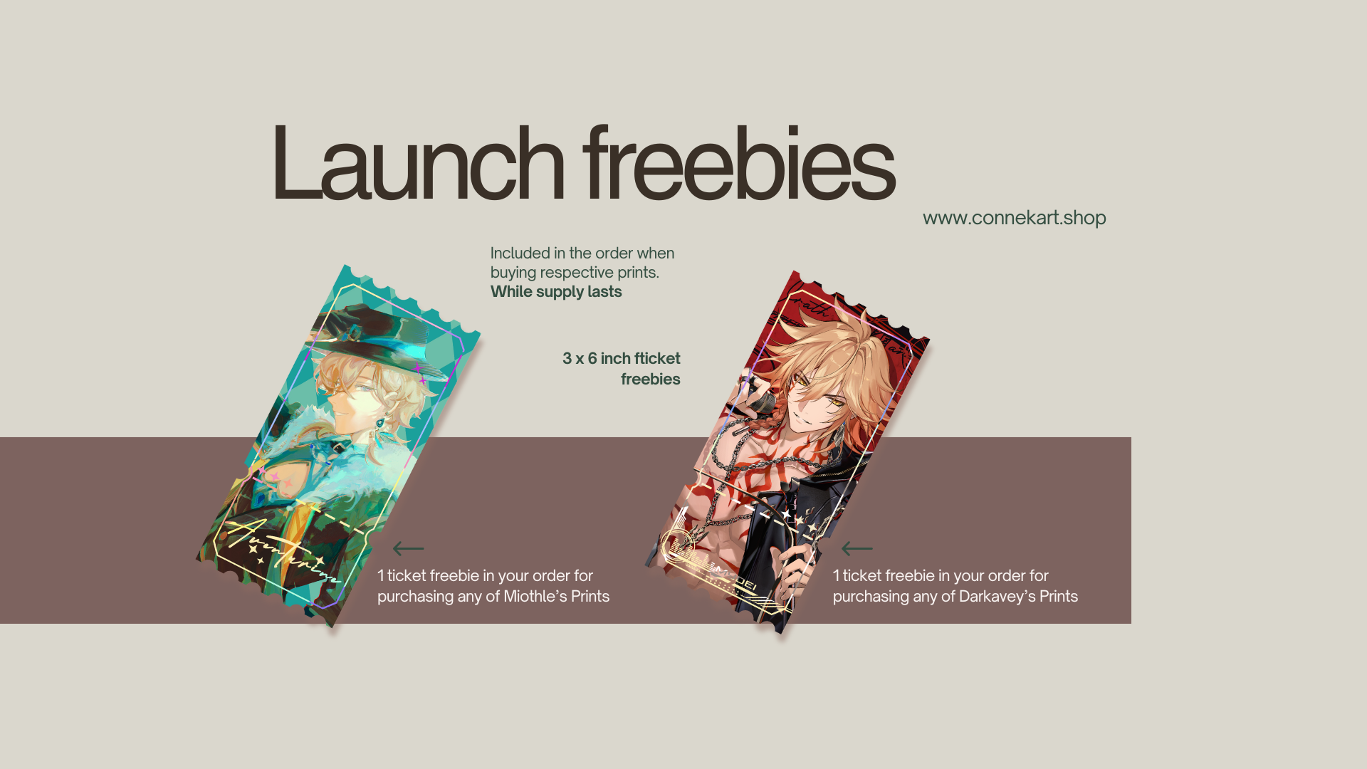 Get 1 free Aventurine ticket when buying Miothle's prints or 1 free Mydei ticket when buying Darkavey's prints while supplies last! Max 1 Ticket each per Order